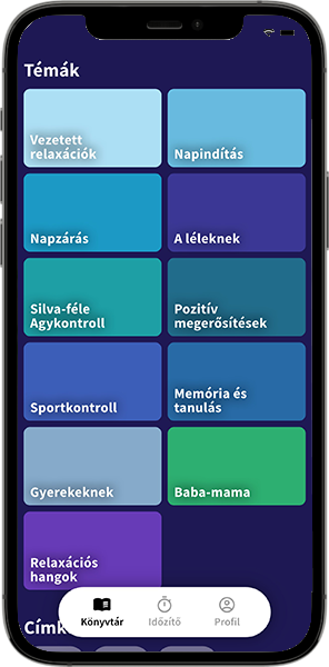 Letöltés és regisztráció után a kezdőképernyőn a “Könyvtár” alatt könnyedén böngészhetsz a 11 kategória és a 3-30 perces meditációk között. A Könyvtár melletti négy négyzet ikonra kattintva a Témák és Címkék között böngészhetsz.